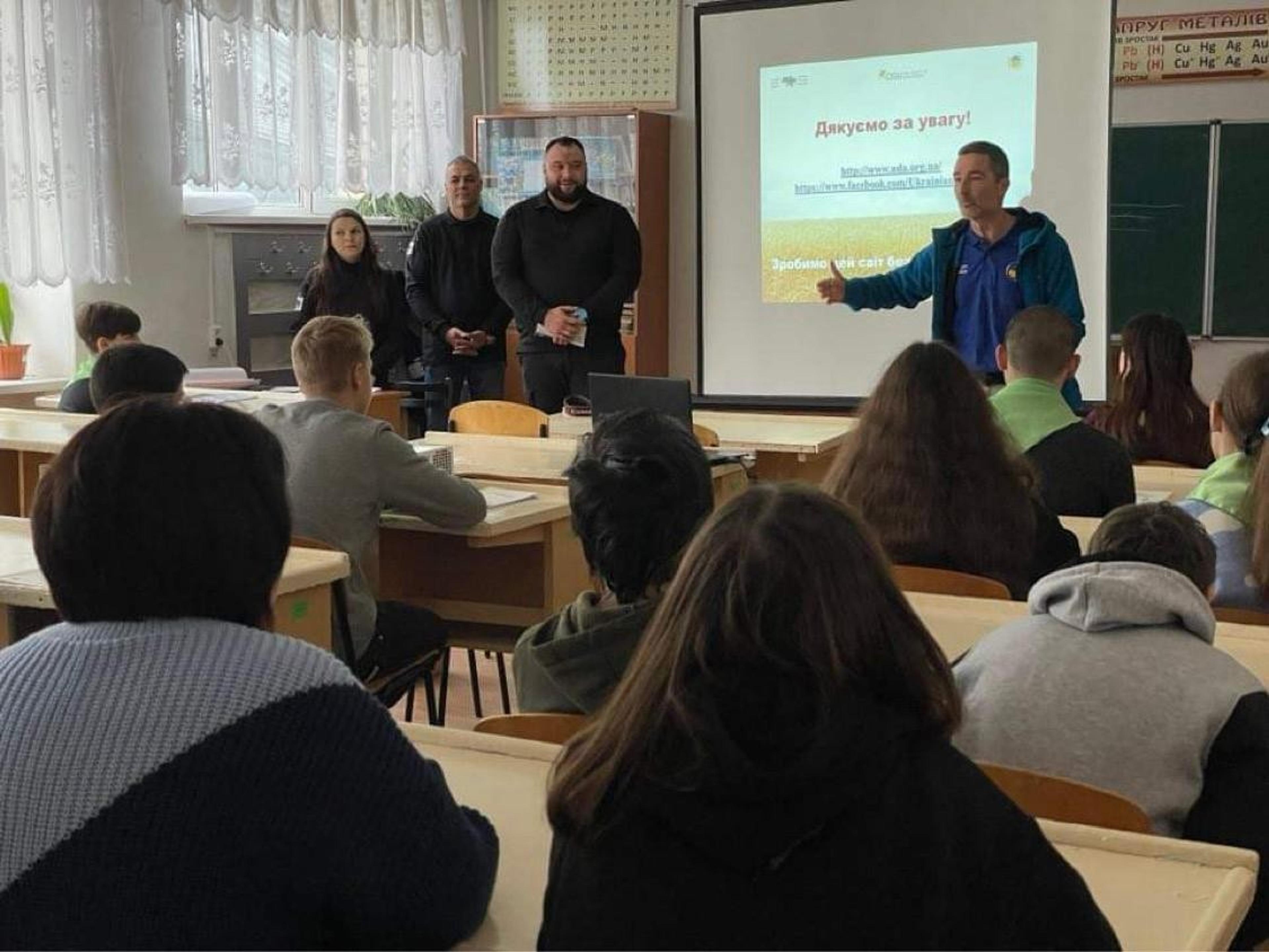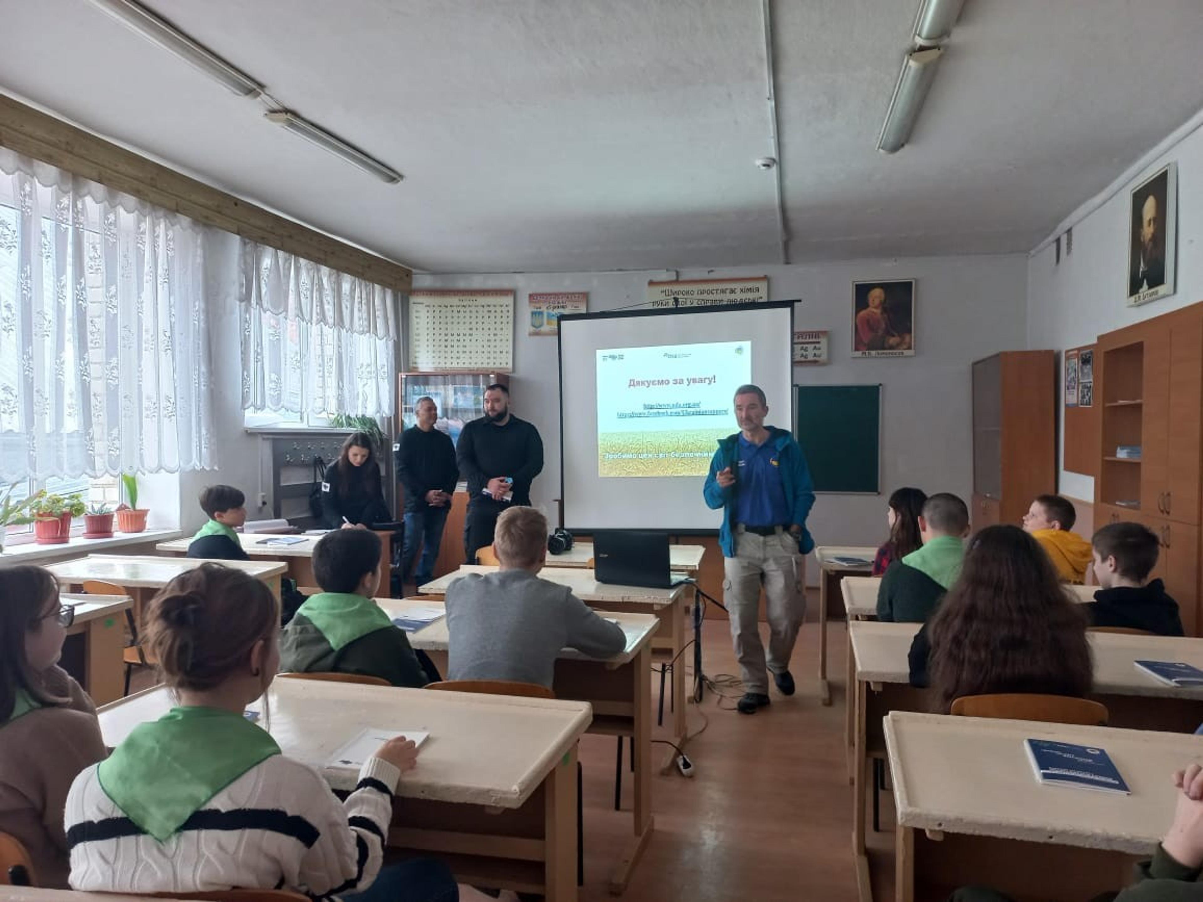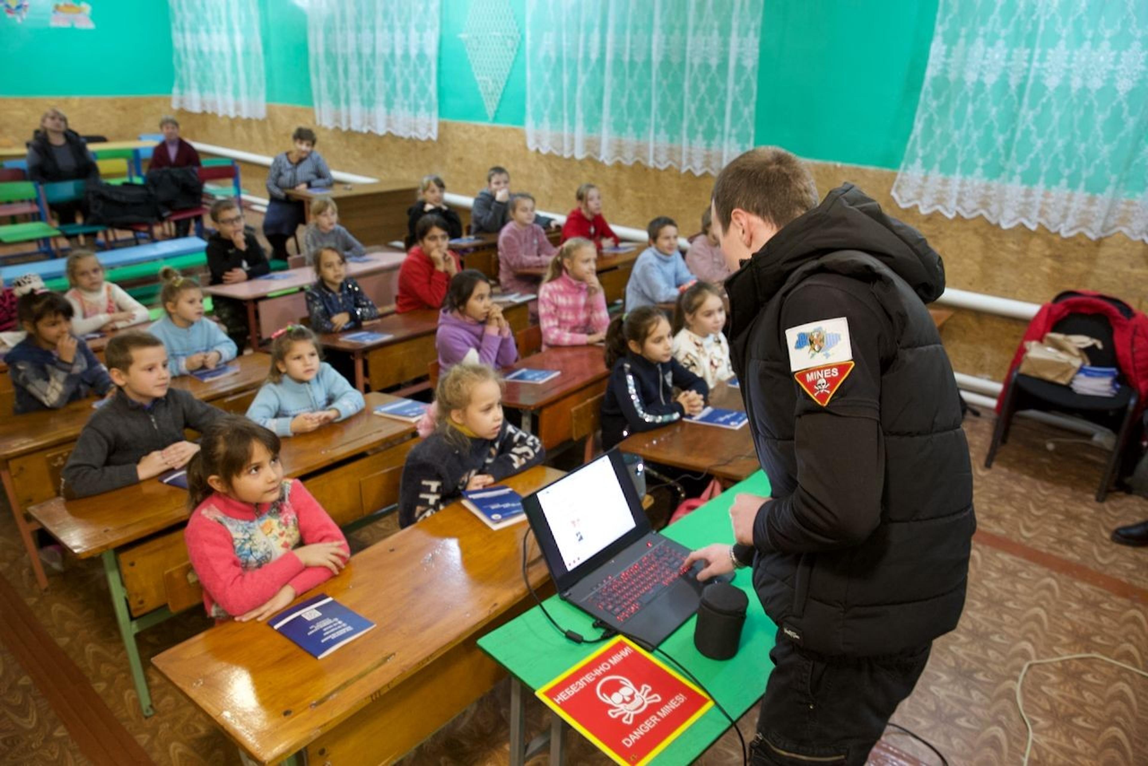 The session took place in a well-kept and well-managed school, though in the shelter, as the air raid siren routinely went off every day, and here, they took the air raid seriously. Children aged 6 to 7 sat obediently, listened to the session, enthusiastically participated in questions and answers, and contributed with practical examples of safe behavior. Ukraine’s wildly popular explosive detection dog (Patron) conveyed through a PowerPoint presentation what the children should do if they come into contact with detonators, landmines, and other ammunition. The session was popular, and the children seemed very interested.