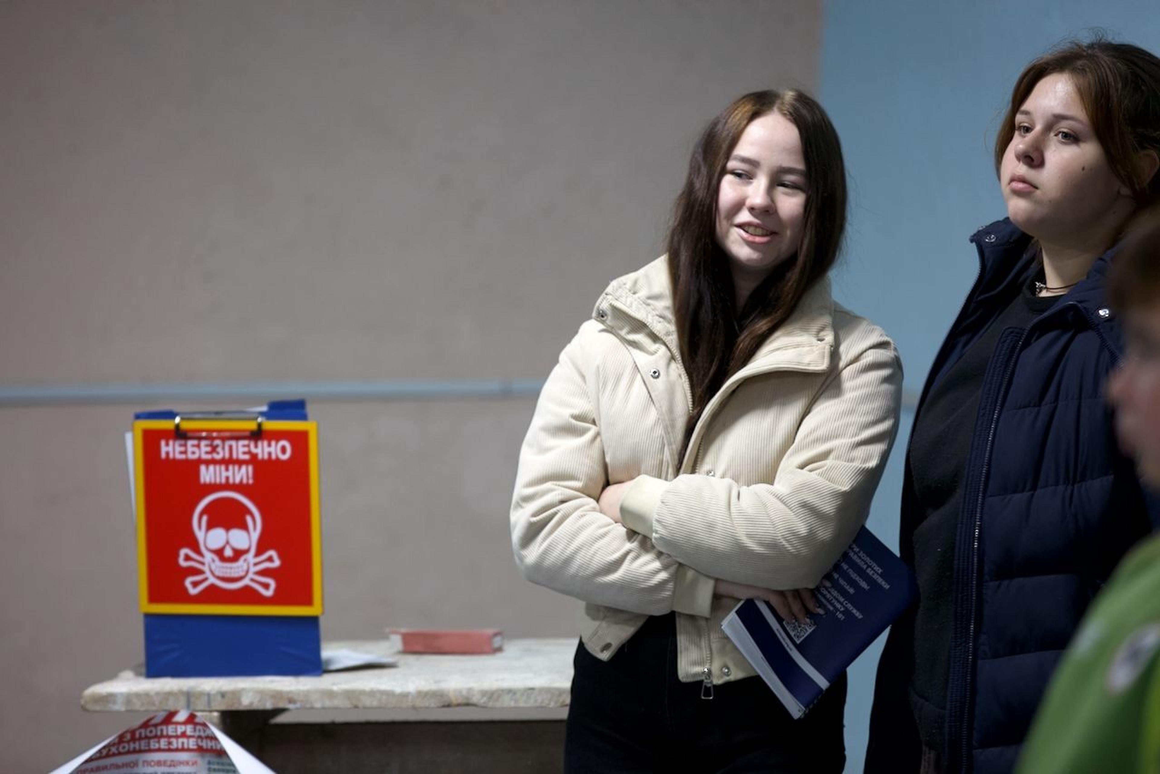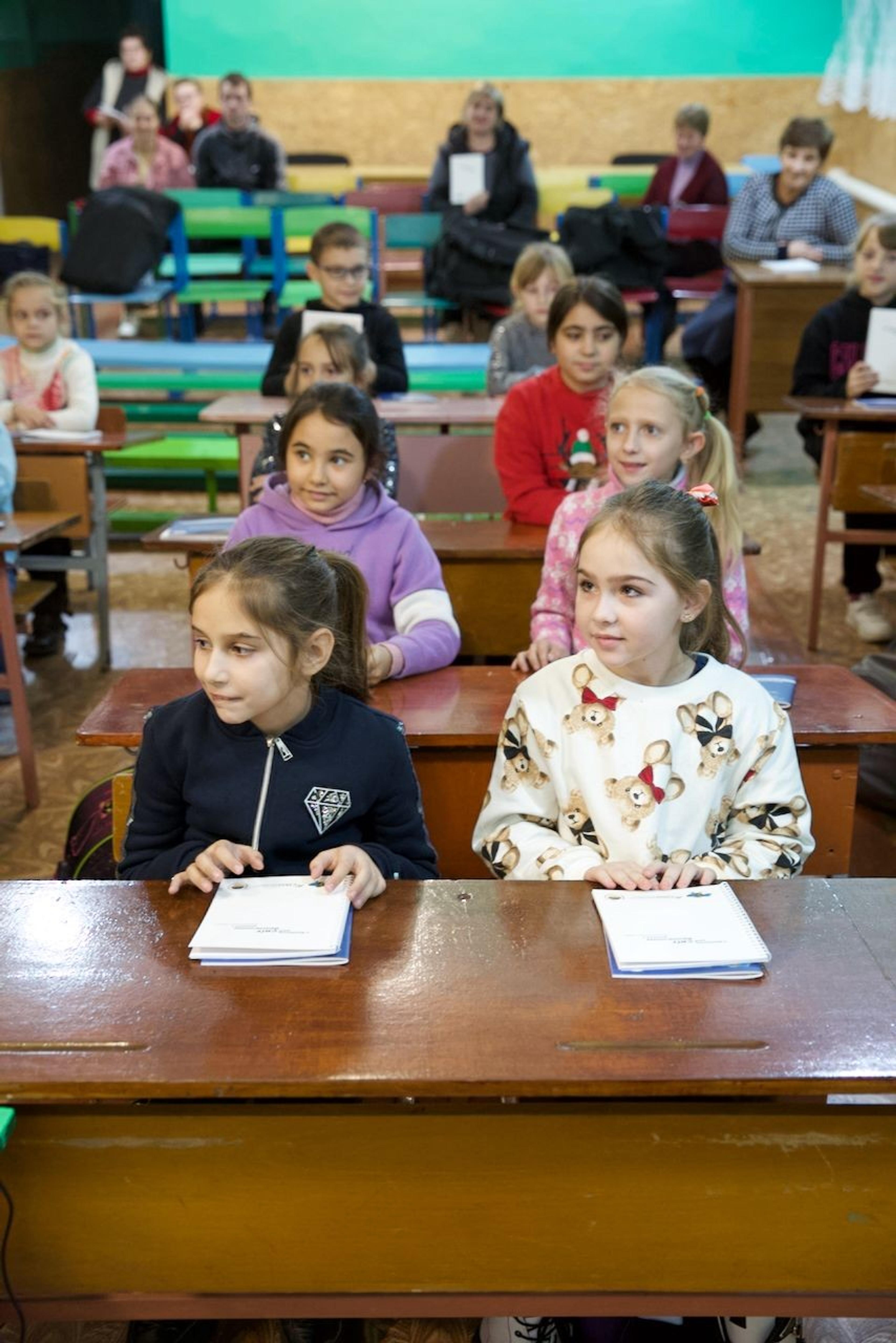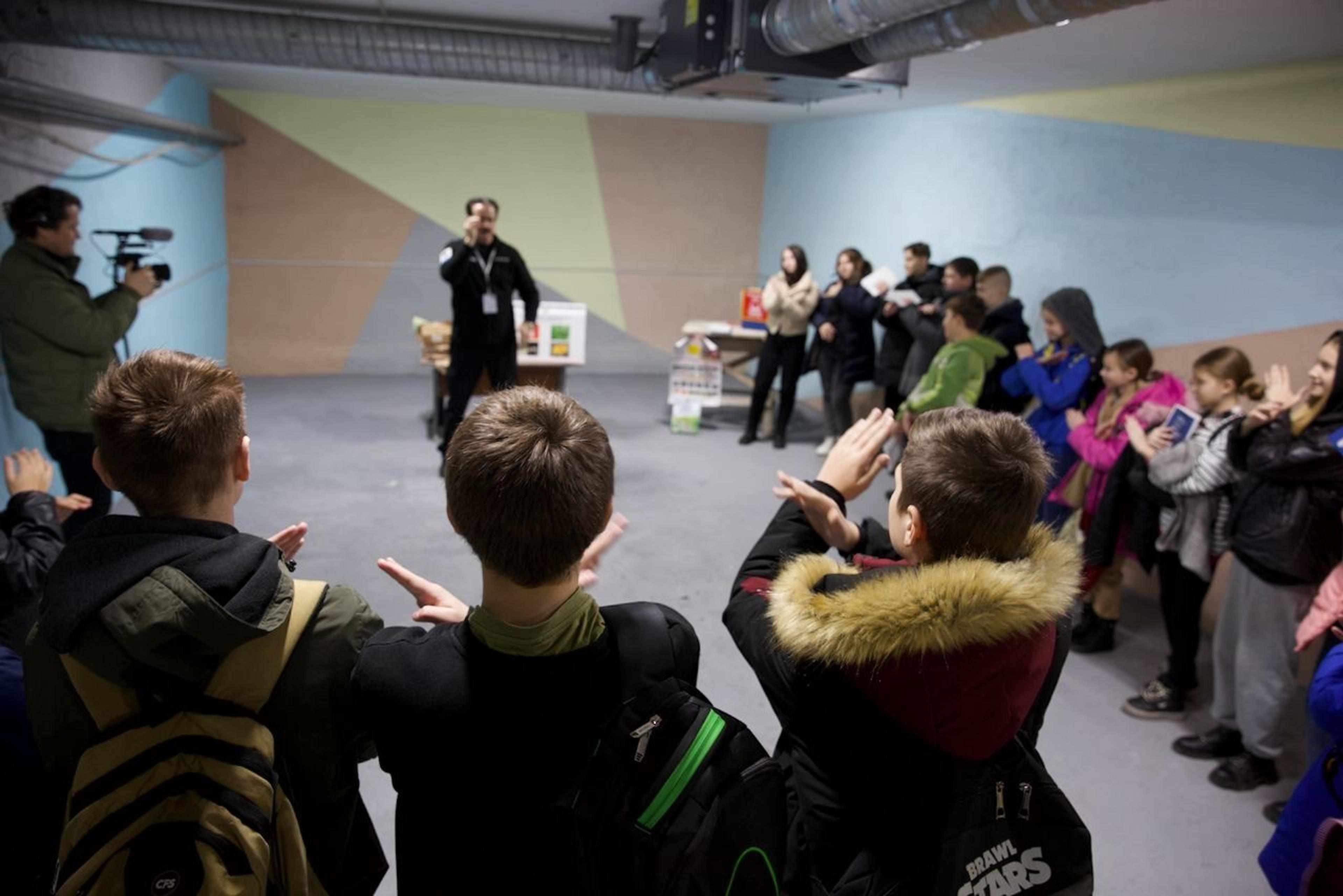 The session took place in a well-kept and well-managed school, though in the shelter, as the air raid siren routinely went off every day, and here, they took the air raid seriously. Children aged 6 to 7 sat obediently, listened to the session, enthusiastically participated in questions and answers, and contributed with practical examples of safe behavior. Ukraine’s wildly popular explosive detection dog (Patron) conveyed through a PowerPoint presentation what the children should do if they come into contact with detonators, landmines, and other ammunition. The session was popular, and the children seemed very interested.