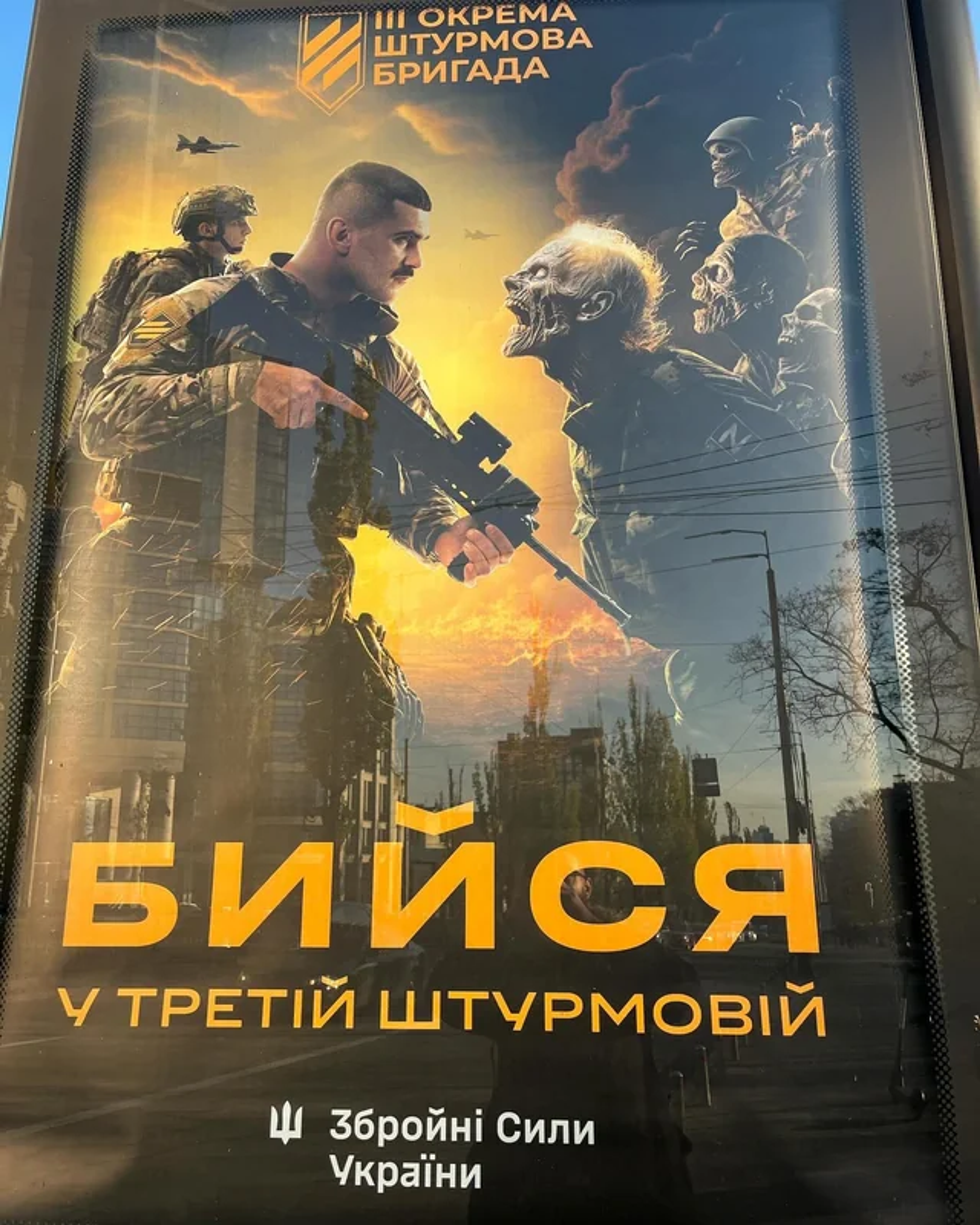 Recruitment poster where soldiers face zombies.